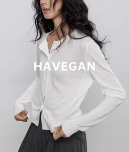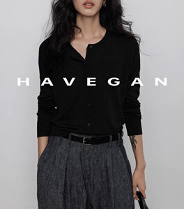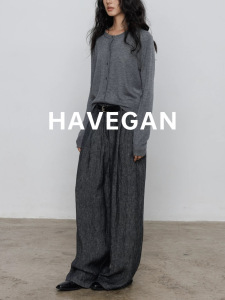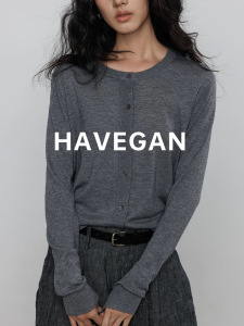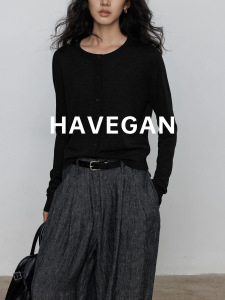 与间HAVEGAN/秋季圆领长袖羊毛针织开衫女宽松慵懒休闲气质上衣