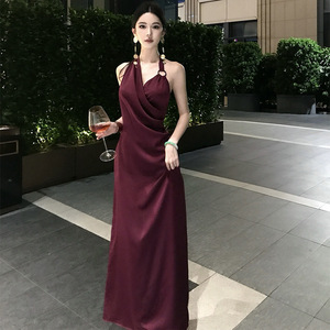 挂脖交错环饰连衣裙锻面立裁垂感长裙生日礼服裙