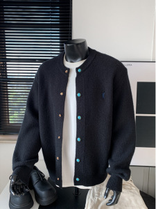 灰色刺绣绿松石开衫毛衣男款秋季高级感美式复古慵懒风针织衫外套