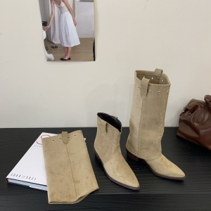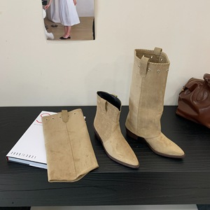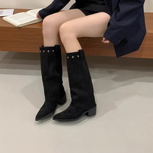 棕色美拉德绒面高跟尖头长筒骑士靴女靴子2025秋冬季西部瘦瘦长靴