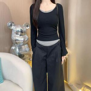 2025秋冬韩版气质撞色假两件修身显瘦洋气百搭简约款打底衫