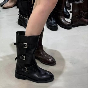 羊皮版~复古圆头粗跟中筒靴女两穿翻折真皮显瘦骑士靴皮带扣短靴