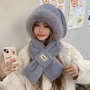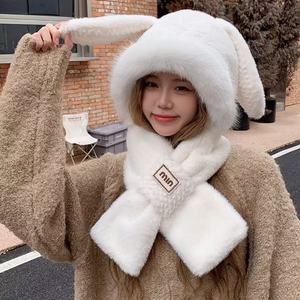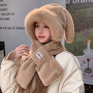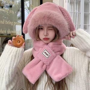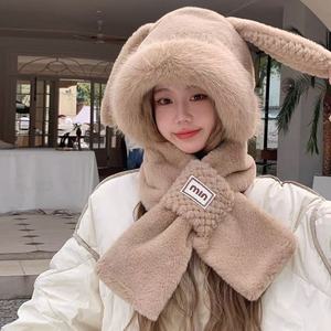 兔耳朵帽子女秋冬季韩版可爱护耳围巾一体保暖防寒冬天加绒包头帽