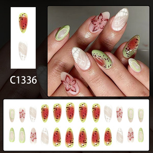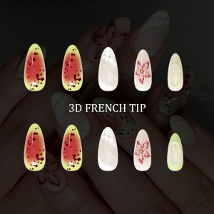 中款亮面水滴甲欧美秋冬美拉德色块晕染花朵3D立体滴胶穿戴甲24片