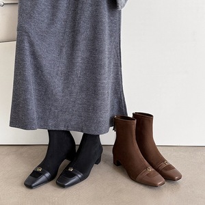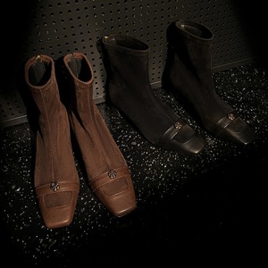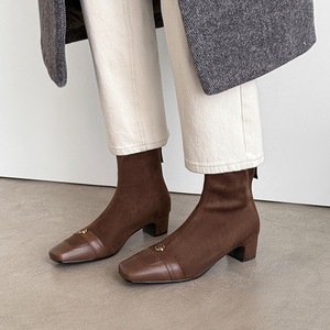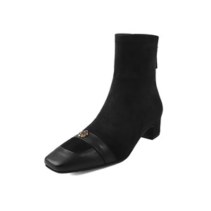 法式复古~山茶花4cm粗跟方头短靴女春秋时尚及踝单裸靴弹力瘦瘦靴