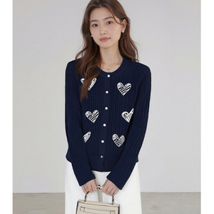 秋季新款2025圆领长袖藏青色针织衫女高级感爱心刺绣气质减龄上衣