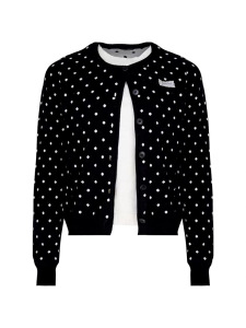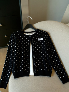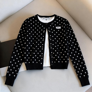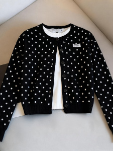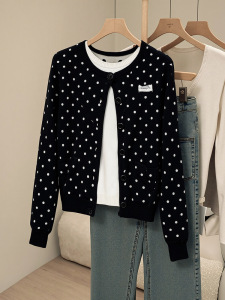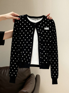 黑色波点假两件针织开衫女秋季早秋短款外搭正肩毛衣外套长袖上衣