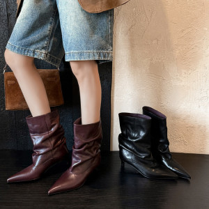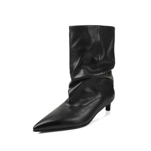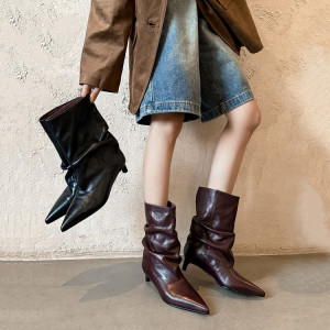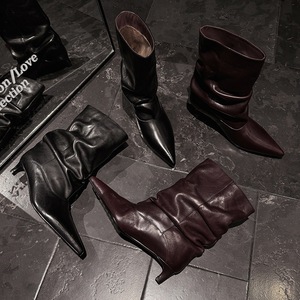 头层牛皮堆堆靴女中靴宽筒靴秋冬新款尖头细跟中跟套筒女式中筒靴