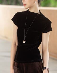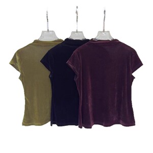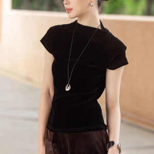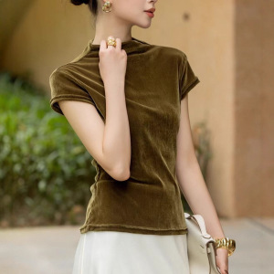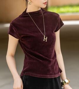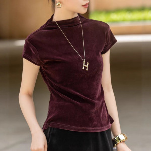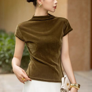 时尚百搭植绒丝绒上衣女秋季新款修身显瘦立领短袖T恤内搭打底衫