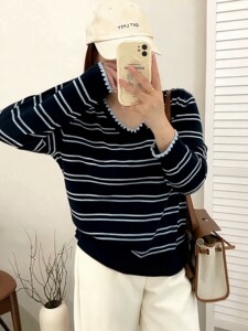 【包邮】大码女装撞色v领长袖上衣女条纹衫2025秋胖mm宽松针织衫