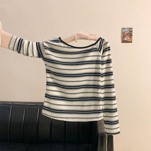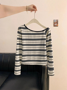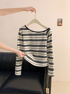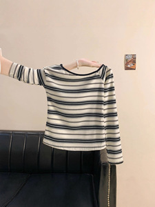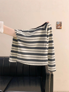韩版chic杏色条纹长袖t恤衫女2025秋斜露肩辣妹修身显瘦内搭上衣