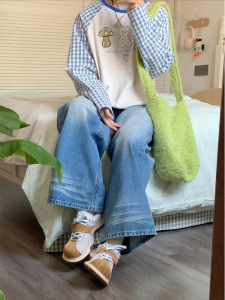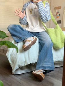 卡通贴布刺绣设计格子喇叭袖拼接假两件拼接2025秋季新款圆领T恤