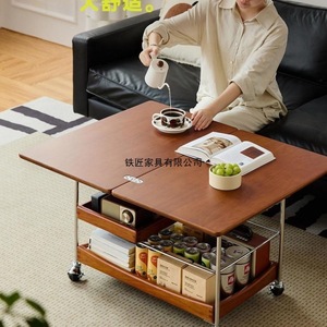 实木折叠茶几中古家用客厅小推车古风小户型复古移动沙发升降收纳