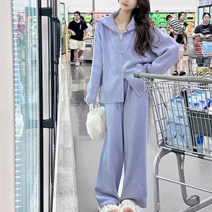 韩版慵懒风运动服套装女秋冬新款时尚拉链针织开衫休闲两件套