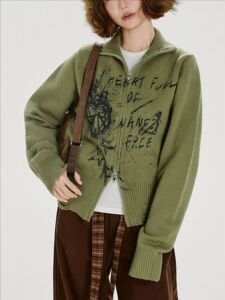 美式复古辣妹印花毛衣开衫女秋冬新款短款针织衫慵懒线衣外套