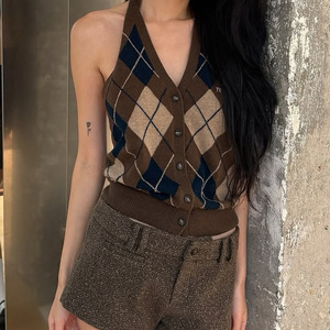 2025新款菱格毛织背心复古学院风修身显瘦露背挂脖V字领排扣上衣