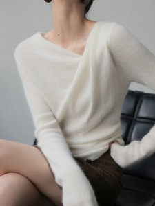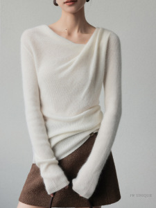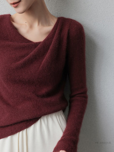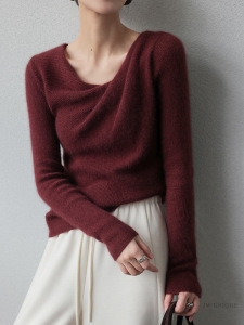 JWUNIQUE酒窝红色不规则荡领长袖针织衫毛衣女冬季新款打底衫上衣