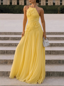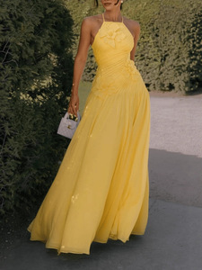 亚马逊跨境欧美外贸女装新款刺绣贴花挂脖抹胸大摆气质时尚连衣裙
