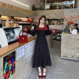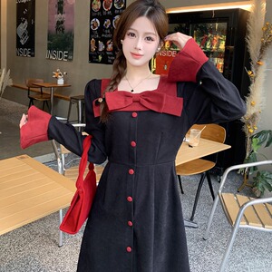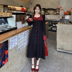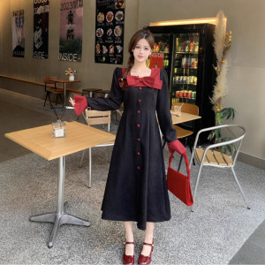 大码法式长袖连衣裙女秋季收腰显瘦蝴蝶结长裙胖MM赫本风气质裙子