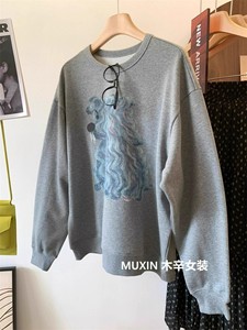 美式复古长毛狗狗印花宽松毛线圈秋季时尚大版圆领休闲卫衣女上衣