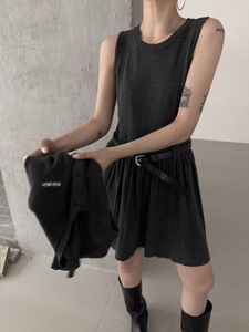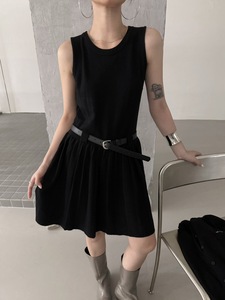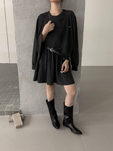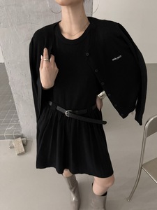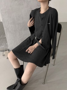 【WOW】韩系圆领短款百褶连衣裙+针织开衫外套两件套装(配腰带)