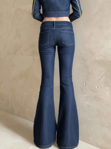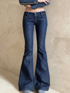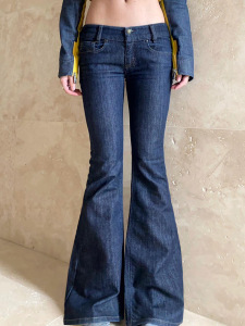 新款跨境美式深蓝色原牛仔色个性街头风低腰修身显瘦喇叭牛仔裤