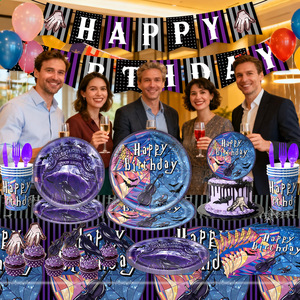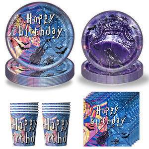紫色星期三电影主题生日派对餐具纸盘纸巾桌布装饰横幅蛋糕插排