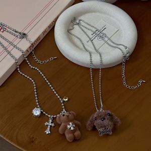 棕色毛绒小熊泰迪狗狗吊坠项链女小众个性甜酷高颜值学生党毛衣链