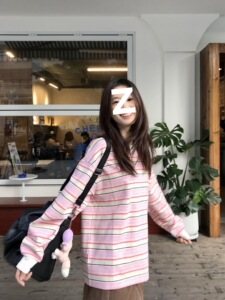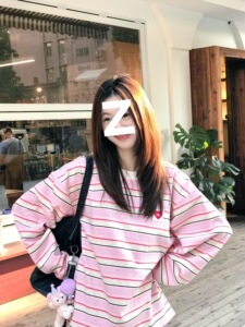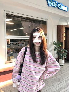 韩系撞色条纹圆领长袖t恤女秋冬设计感小众别致爱心宽松慵懒上衣