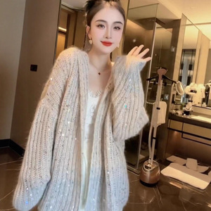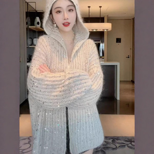 高级感时尚亮片粗针连帽针织开衫女2025春秋款毛衣外套轻奢上衣潮