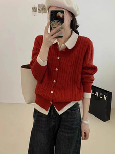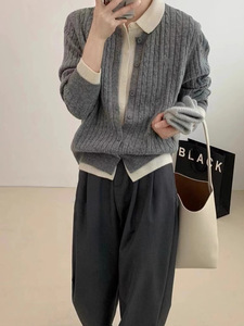 欧洲站polo领长袖时尚款针织衫假两件拼接设计感开衫宽松休闲毛衣