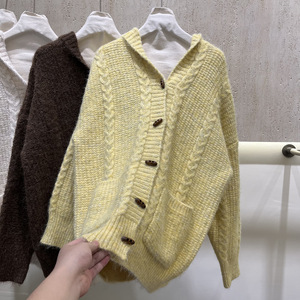 慵懒风连帽牛角扣开衫毛衣女2025秋冬新款韩版宽松麻花针织外套厚