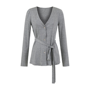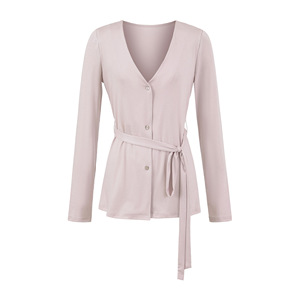 天丝轻薄防晒开衫上衣女秋季新款V领排扣修身显瘦高腰系带显瘦T恤