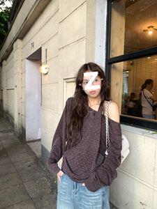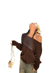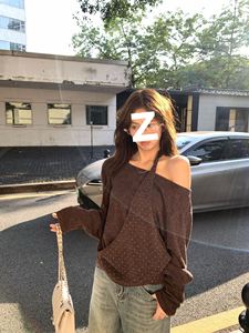 美式复古波点挂脖假两件长袖t恤女秋季松弛感宽松绝美露肩打底衫