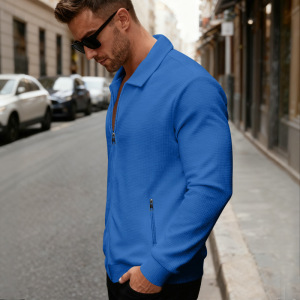 跨境秋季男士华夫格翻领拉链长袖夹克亚马逊休闲polo修身开衫外套