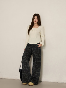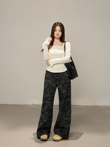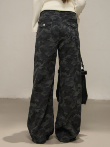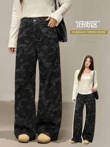 美式迷彩阔腿牛仔裤秋装女装新款胖mm大码女装宽松显瘦裤子66048