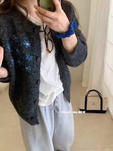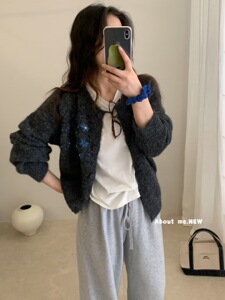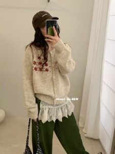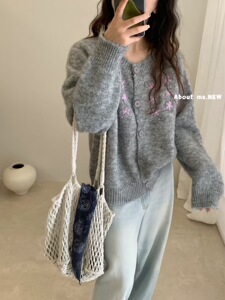 甜美刺绣花朵针织开衫女春秋新款宽松设计感时尚洋气灰色毛衣外套
