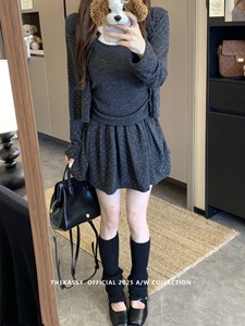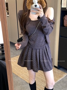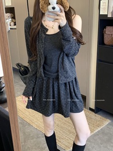 实拍 2025秋季甜美波点长袖开衫外套+吊带背心+百褶短裙三件套女