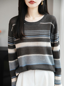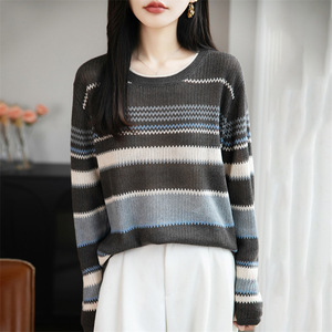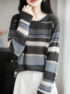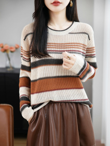 韩系时尚撞色条纹毛衣早秋羊毛混纺宽松长袖减龄休闲圆领针织衫女