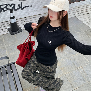 燕麦色2025新款早秋长袖打底针织衫女百搭休闲圆领正肩修身上衣