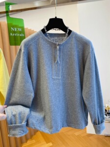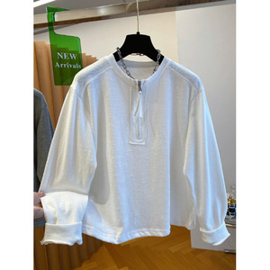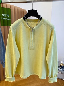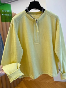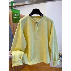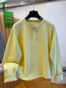 跨境纯色韩系半拉链黄色雪花棉t恤女装长袖2025新款宽松休闲上衣