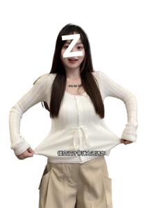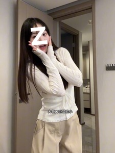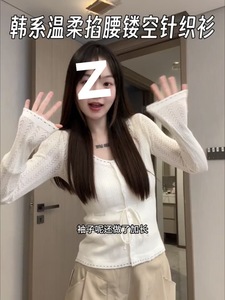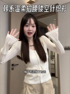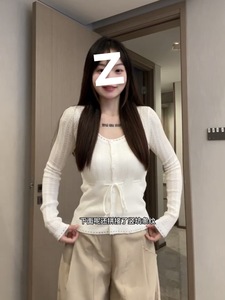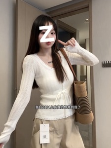韩系白色u领系带长袖针织衫女秋冬季单穿绝美镂空提花打底衫上衣