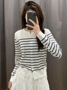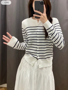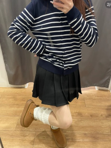 韩系复古撞色条纹毛衣女秋冬新款宽松慵懒风圆领针织开衫长袖外套
