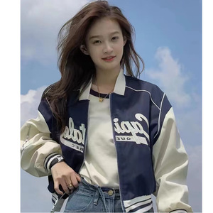 秋冬跨境时尚美式夹克休闲字母刺绣棒球服宽松立领外套短款小个子