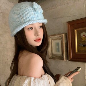 秋冬新款马克龙色花朵卷边针织包头帽女韩系甜美小清新套头毛线帽