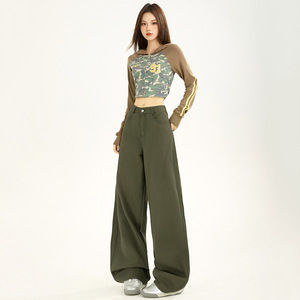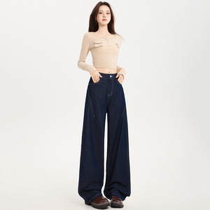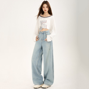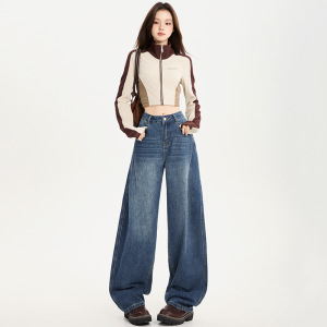 稚橘#美式复古侧缝拉高阔腿牛仔裤女宽松显瘦遮肉潮流百搭弯刀裤