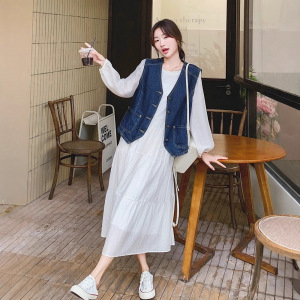 初秋穿搭高级感套装复古气质牛仔马甲长袖连衣裙今年流行两件套裙