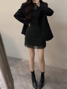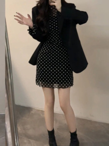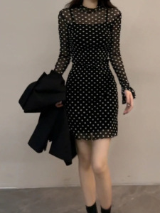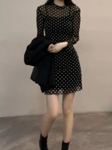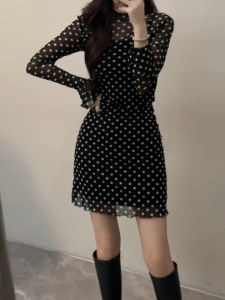 长袖圆领修身波点连衣裙女时尚显瘦气质网纱裙子初秋新款裙子2025