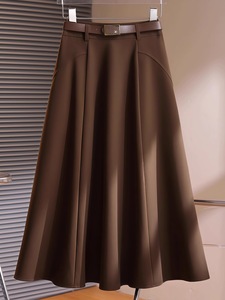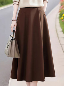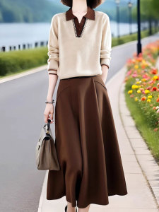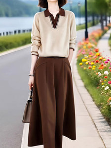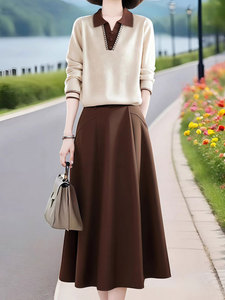 秋冬季穿搭一整套高级感假两件针织衫上衣咖色半身裙两件套装女