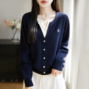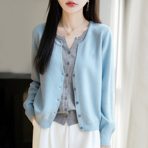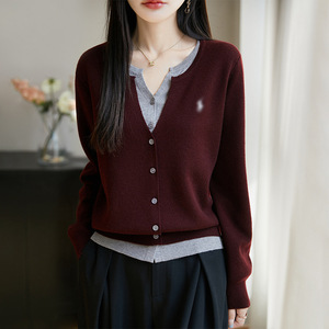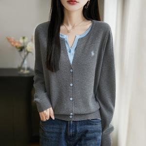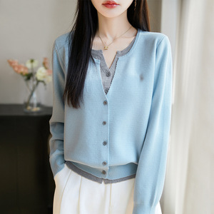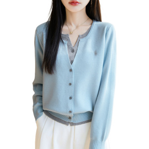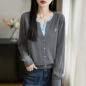 拼色假两件针织miu系开衫女新款撞色外搭格雷系上衣女装精纺毛衫